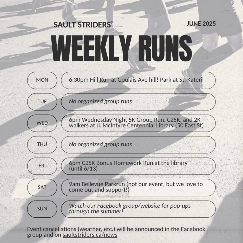 Hey Striders! The group run schedule has been updated for June. The main change is the at the Sunday road run is being dropped for the summer, while we head to the trails. We’ll have frequent pop-ups on Sundays, so watch here and in the Facebook group to see where we’ll be.
