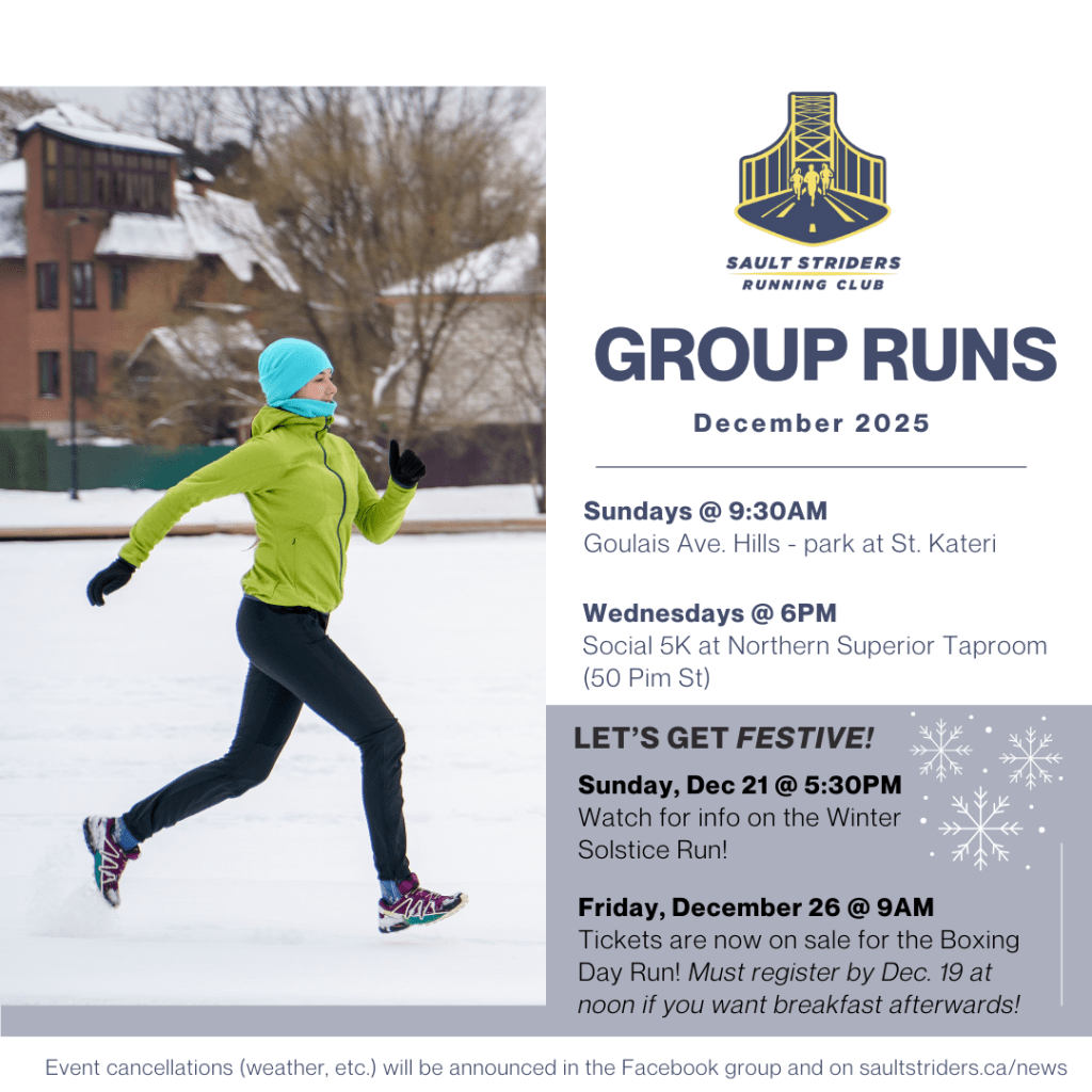 Hey Striders! Here’s our December group run schedule. We’re still nailing down details for the Solstice run on Dec 21, and the Boxing Day Run is open for registration until Dec. 19!