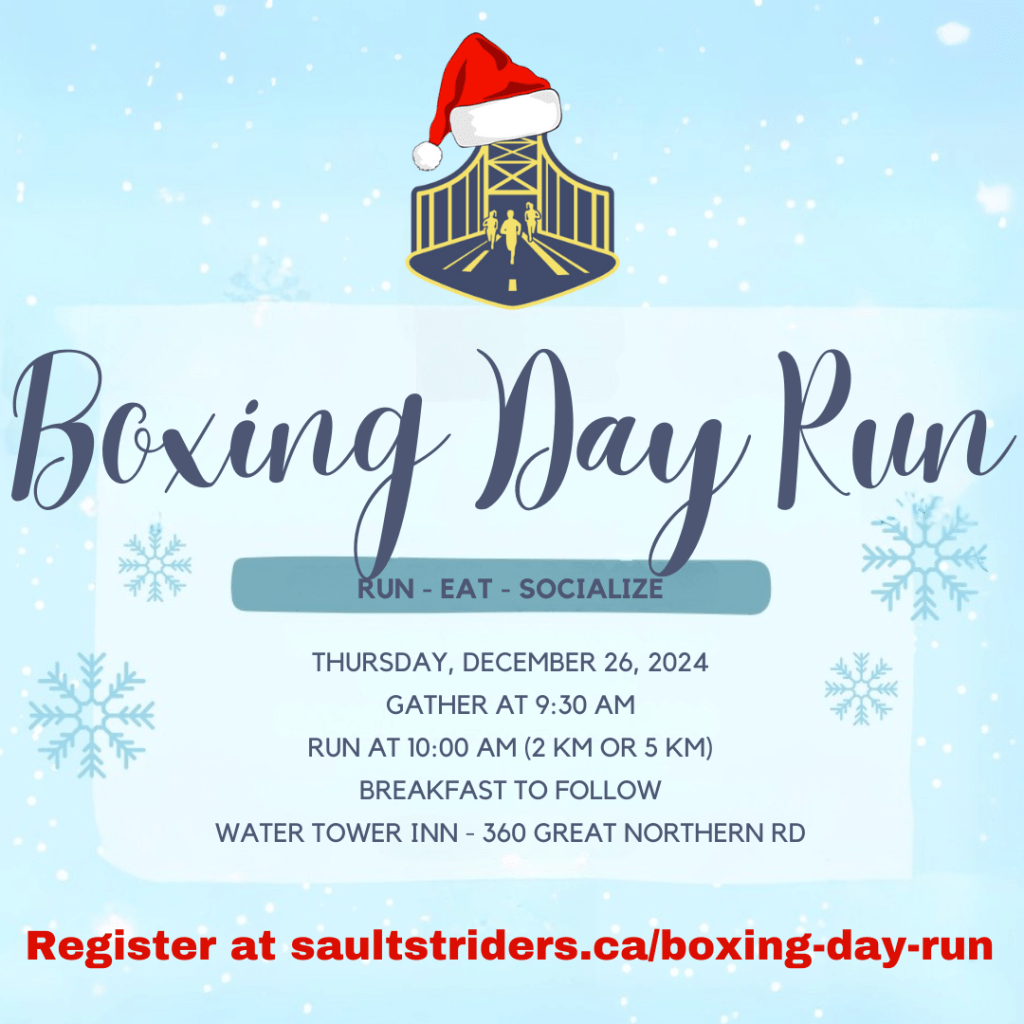 **Thursday 10am** Annual Boxing Day run and breakfast at the Water Tower Inn! 2K and 5K run options and a fantastic breakfast to follow. We will have awards, draws for prizes and a great time catching up on the past year. Please sign up in advance at https://raceroster.com/events/2024/97172/boxing-day-run-2024 ** Runs start at 10 – please arrive a little early! **